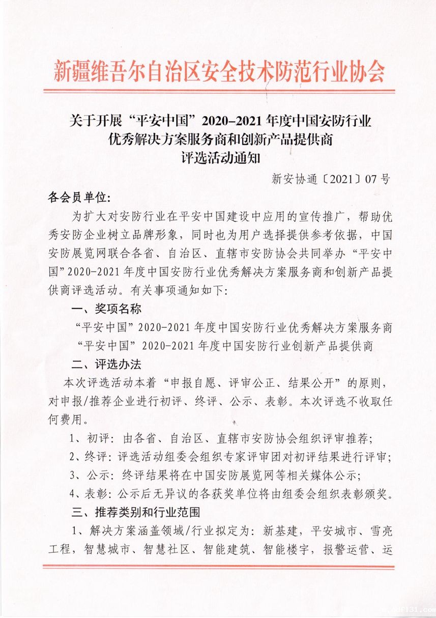 关于开展“平安中国”2020-2021年度中国安防行业优秀解决方案服务商和创新产品提供商评选活动通知