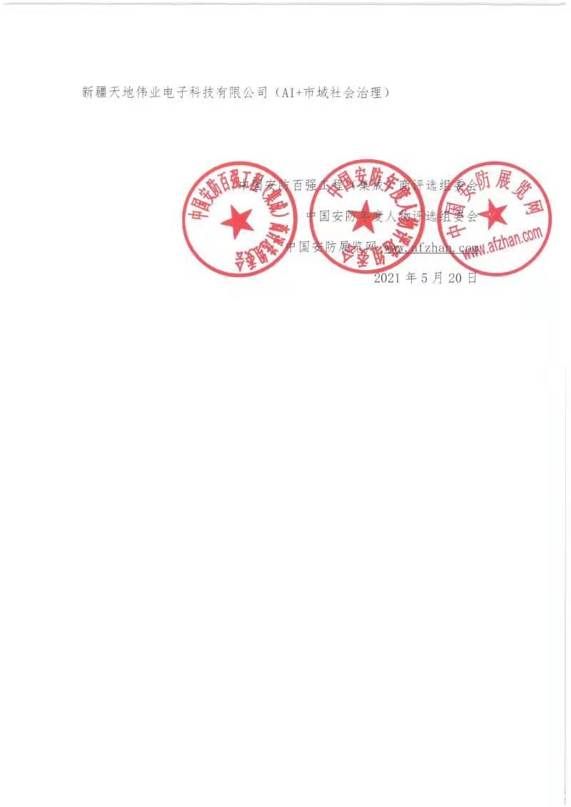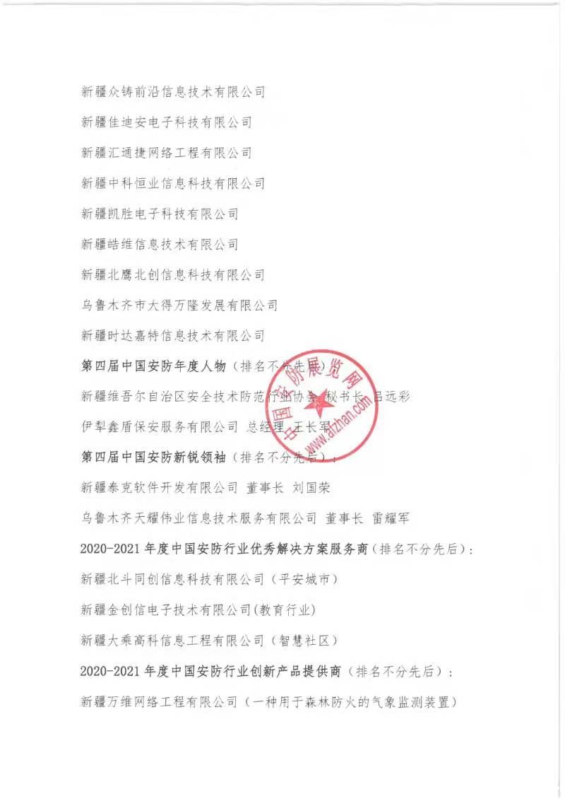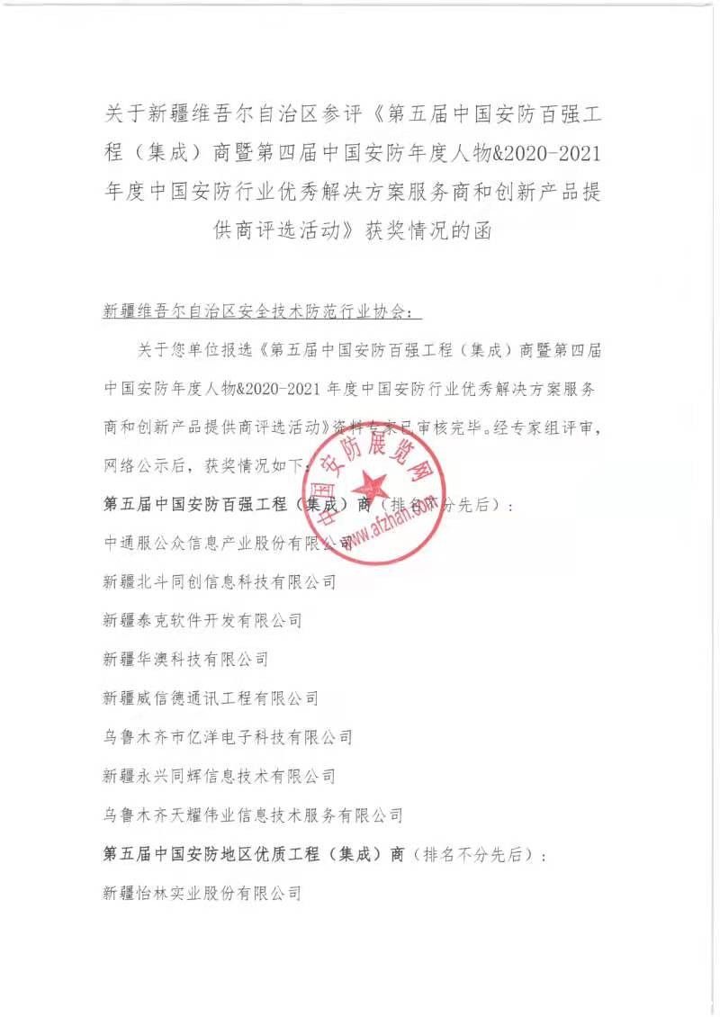 关于新疆维吾尔自治区参评《第五届中国安防百强工程(集成)商暨第四届中国安防年度人物、2020-2021年度中国安防行业优秀解决方案服务商和创新产品提供商评选活动》获奖情况的函