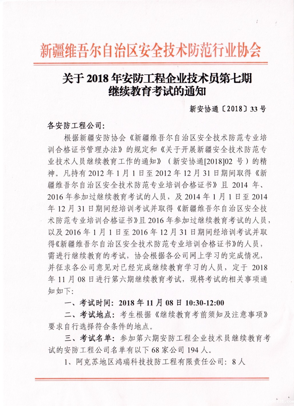 关于2018年安防工程企业技术员第七期继续教育考试的通知