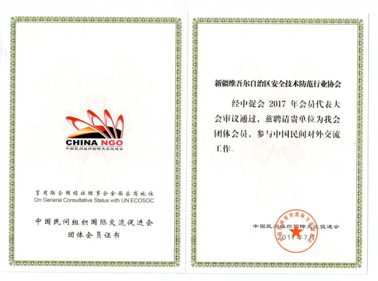 2017年12月,新疆安防协会由自治区人民政府外事办公室(侨务办公室)、自治区民政厅社团处向中国民间组织国际交流促进会(中促会是中联部所属的全国性社会组织,主要是协调推动国内社会组织和民间人士广泛参与重要国际活动、开展国际交流和民生项目,促进中外民心相通。以下简称中促会)推荐为团体会员,经中促会会员代表大会审议通过,并颁发团体会员证书。