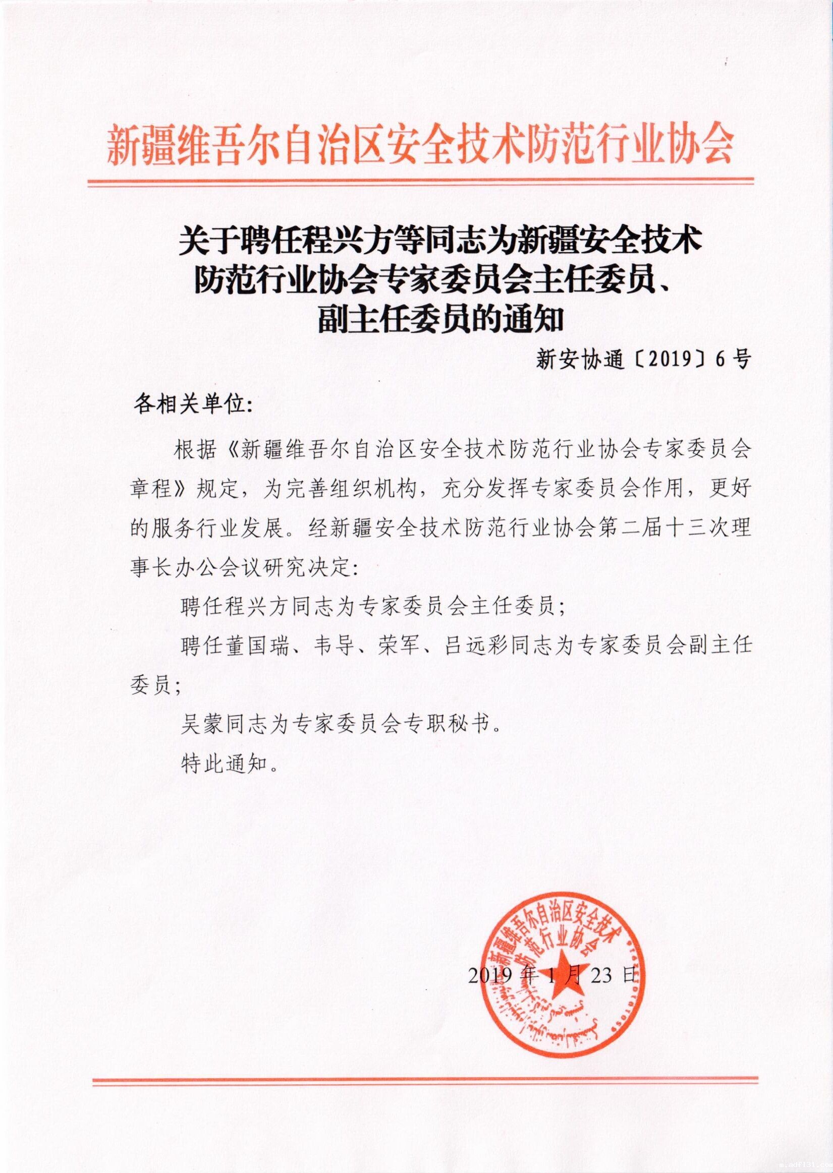 关于聘任程兴方等同志为新疆安全技术防范行业协会专家委员会主任委员、副主任委员的通知